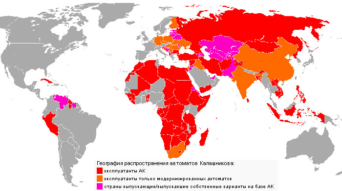 Автомат Калашникова и его модификации, включая лицензионные и нелицензионные, является самым распространенным в мире стрелковым оружием. Был разработан Михаилом Калашниковым в 1947 году, через два года принят на вооружение в советской армии. Выдержал множество модернизаций, по мнению экспертов является образцом надежности и простоты обслуживания.