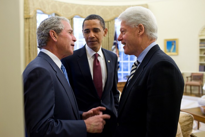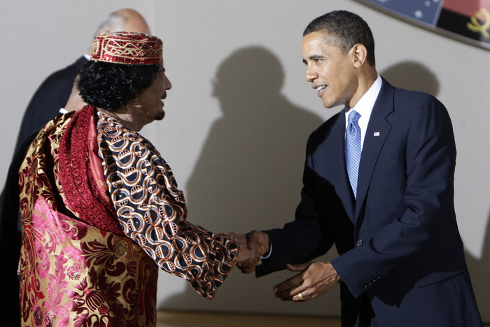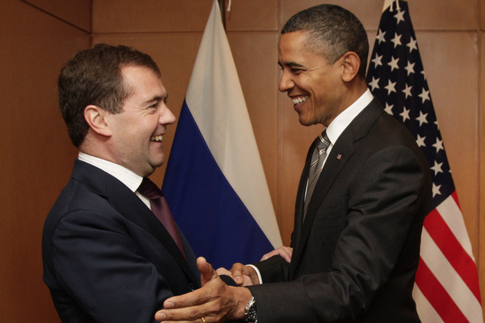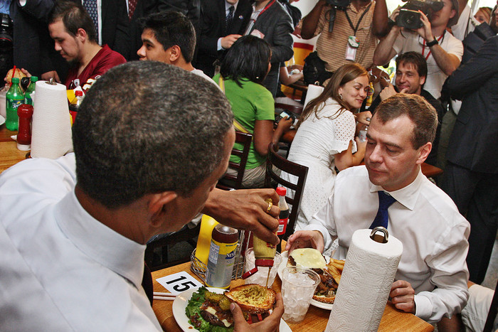 Дмитрий Медведев и Барак Обама перед началом двусторонней встречи в рамках саммита лидеров стран Азиатско-тихоокеанского экономического сотрудничества (АТЭС) Барак Обама и Дмитрий Медведев во время завтрака в ресторане Ray's Hell Burger. Барак и Мишель Обама женаты почти двадцать лет. Она, как и муж, адвокат. С Обамой познакомилась на работе, в юридической компании «Сидней Остин», где они оба работали в начале 1990-х. Будучи сенатором от штата Иллинойс (пятым темнокожим сенатором за всю историю США), Обама не раз посещал Белый дом по приглашению тогдашнего президента Джорджа Буша. Главными слоганами президентской кампании Обамы стали Change We Need (нам нужны перемены) и Yes We Can (Да, мы можем), ставшего объектом для многочисленных пародий Ликвидация террориста № 1 Усамы бин Ладена, за которой руководство США следило в прямом эфире, стала одной из наиболее впечатляющих успехов администрации Обамы Первый чернокожий президент США, Обама не является потомком чернокожих рабов — его отец был кенийцем, который приехал учиться в американский Университет Гонолулу на Гавайях за счет миссионерской школы в Найроби Единственный раз Обама пожал руку ливийскому лидеру Муамару Каддафи на приеме перед обедом на саммите «большой восьмерки» в 2009 году. Спустя два года США будут бомбить Ливию, принуждая Каддафи отказаться от власти. Вообще-то любимый вид спорта президента Обамы – баскетбол Премьер-министр Италии Сильвио Берлускони сделал Обаме, по его мнению, «отличный комплимент», навал американского президента «молодым красивым парнем с отличным загаром». Обама старается вести здоровый образ жизни, однако до прошлого года был заядлым курильщиком.