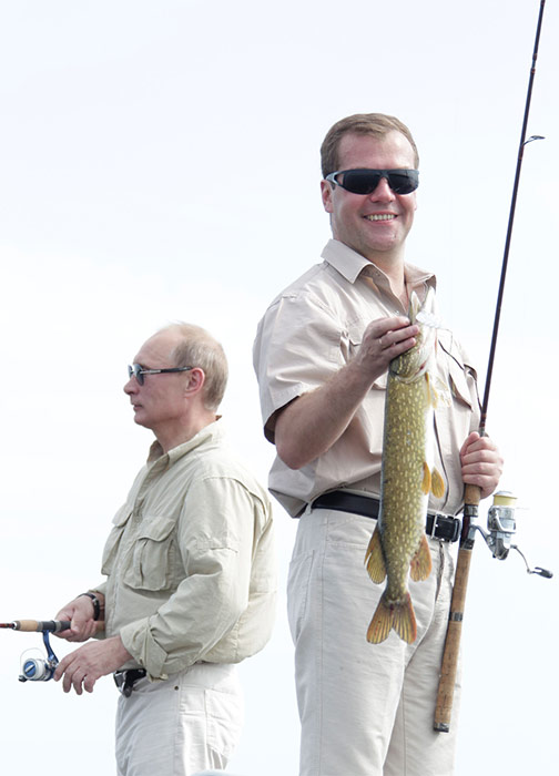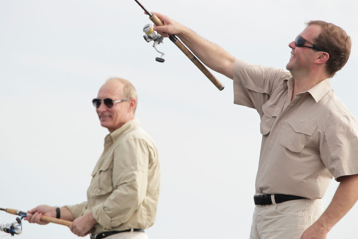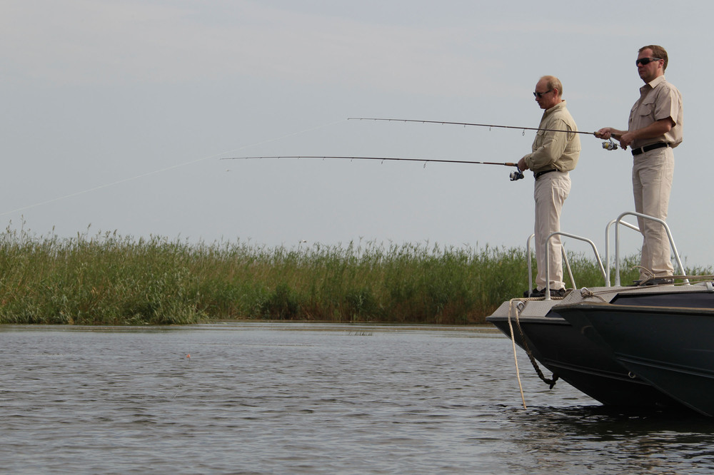 Президент Дмитрий Медведев и премьер-министр Владимир Путин встретились в Астраханской области, чтобы вместе порыбачить и покататься на катере по Волге.