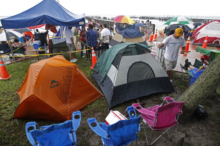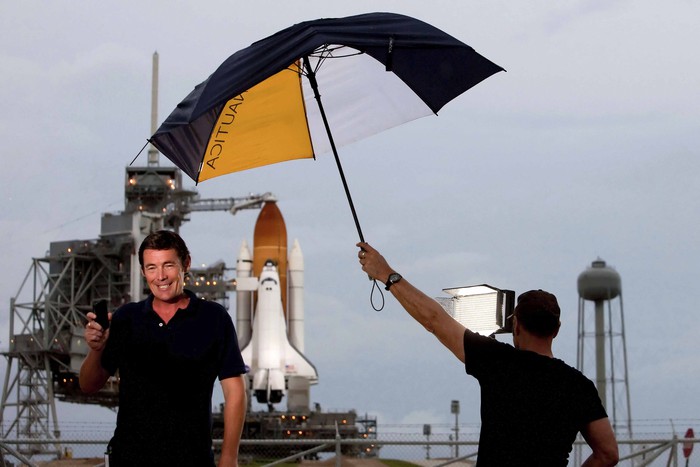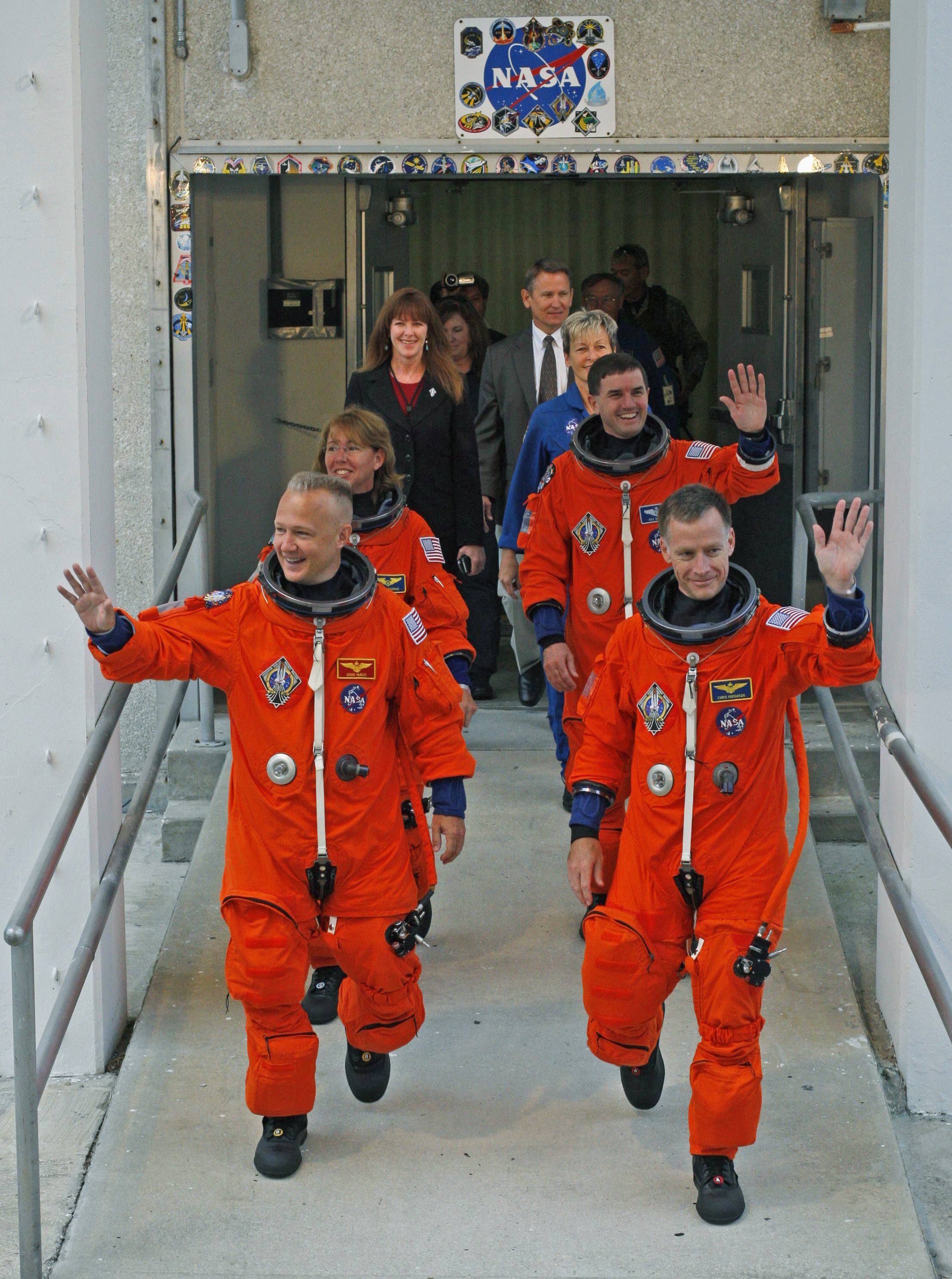 Уже 185 человек летали в космос на «Атлантисе». Обычно экипаж состоял из шести-семи астронавтов, в нынешнем их четверо: командир корабля Крис Фергюсон (крайний слева) третий раз летит на шаттле. Пилот Даг Херли (второй слева) — второй. Сэнди Магнус и Рекс Уолхейм — в первый и точно последний. Зрители разбили палатки для защиты от дождя в ожидании запуска.