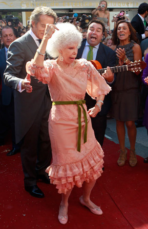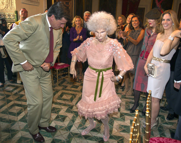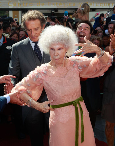 5 октября в Испании состоялась самая громкая свадьба года – 85-летняя герцогиня Альба вышла замуж за 61-летнего сотрудника департамента соцобеспечения Альфонсо Диеса Их браку предшествовал большой скандал. Родственники и даже король Испании противились свадьбе главы дома Альба, который имеет 500-летнюю историю, и простолюдина. Герцогиня является самой титулованной особой мира, и занесена в книгу рекордов Гинесса Герцогиня Альба утверждает, что Альфонсо влюбился в нее с первого взгляда. Пара познакомилась 30 лет назад. Однако тогда она выходила замуж за своего второго избранника. Диес также состоял в отношениях Родственники герцогини подозревали, что ее новый муж, который моложе ее на 24 года, видит в жене всего лишь ее состояние в 3,5 млрд евро Однако герцогиня утверждала, что сама потащила Альфонсо под венец. К этому времени они встречались три года, и престарелая леди говорила, что ее религия не позволяет ей продолжать отношения вне брака Испанцы не удивились решению аристократки, известной своими эксцентричными выходками. Она предпочитает надевать яркие платья, носит смешную прическу и делает пластические операции Для того, чтобы родня дала паре спокойно расписаться, герцогиня Альба заставила Альфонсо написать отказ от наследства и передала близким часть своего имущества, впрочем оставив себе состояние в 2,5 млрд евро Титулованная невеста даже обнародовала завещание, в котором четко написано кто именно и что получит в наследство после ее смерти Свадьба в замке герцогини в Севилье прошла достаточно скромно – было всего лишь 40 гостей Аристократка утверждает, что у нее молодая душа, и ей не важны цифры, намекая как на свои деньги, так и на возраст супруга. В доказательство этому она станцевала на свадьбе фламенко