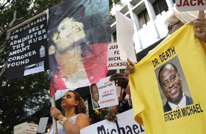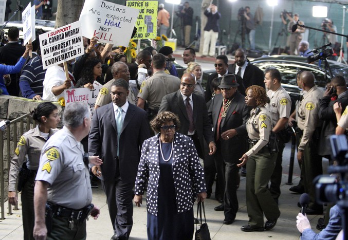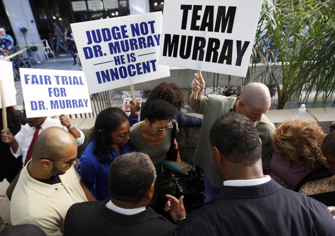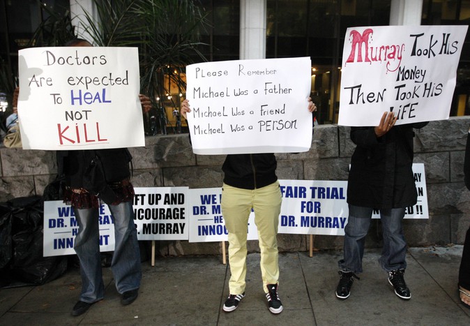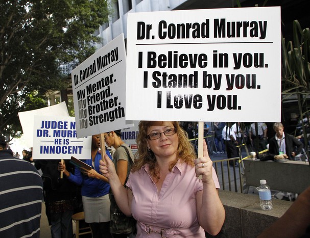 Перед смертью Майкл Джексон репетировал новую программу, которую собирался показать во время 50-ти выступлений в Лондоне. Как пишет The Los Angeles Times, группа фанатов, которая организовала движение «Justice 4 Michael» («Справедливость для Майкла») превратила вход в суд «буквально в рекламный плакат». По данным следствия, врач дал знаменитости чрезмерную дозу пропофола, который является мощным обезболивающим средством, а не снотворным. Личный врач певца обвиняется в непредумышленном убийстве. Выбор присяжных заседателей оказался долгим и нелегким делом, потому что во всей стране трудно найти человека, который не знал бы о Майкле Джексоне и не жалел бы о его смерти. Плакатами фанаты обклеили в том числе и фасад здания. Стоявшие кричали «Справедливости для Майкла!». В суд приехали родители Джексона Кэтрин Джексон. И отец Джо Джексон. Знаменитая сестра Джексона Джанет Джексон. Майкл Джексон страдал от бессоницы и не мог спать без лекарства. Он поселил личного врача Конрада Мюррея в своем особняке и платил ему 150 тысяч долларов в месяц. . С собой фанаты принесли и фотографии Джексона в больнице. После смерти певца они разошлись в сети. Зал суда на первом заседании по делу Конрада Мюррея был переполнен. В фан-клубе право присуствовать на судебном заседании разыгрывают по специальной лотерее. Другую сторону у входа в суд заняли сторонники обвиняемого Мюррея. Они считают, что врача пытаются незаслуженно оклеветать.