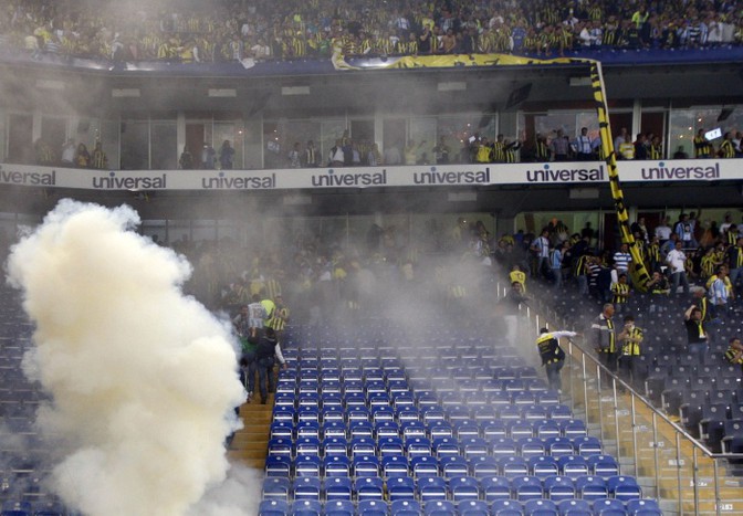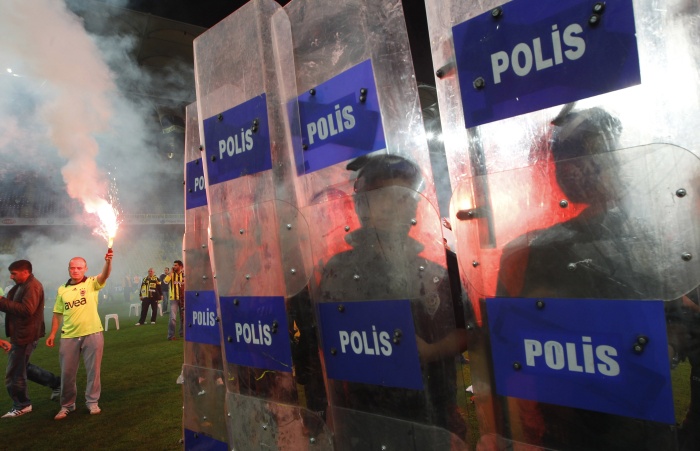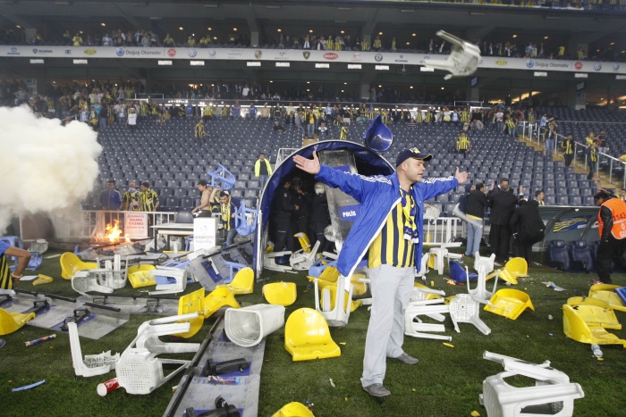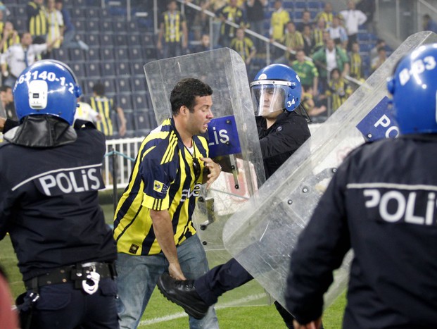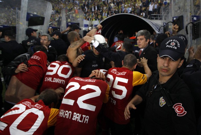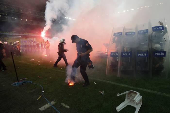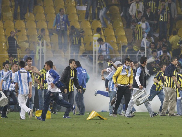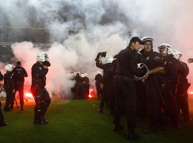 Болельщики выскочили на поле и устроили беспорядки после матча чемпионата Турции по футболу, в котором играли «Фенербахче» и «Галатасарай». Беспорядки затем перекинулись в город.