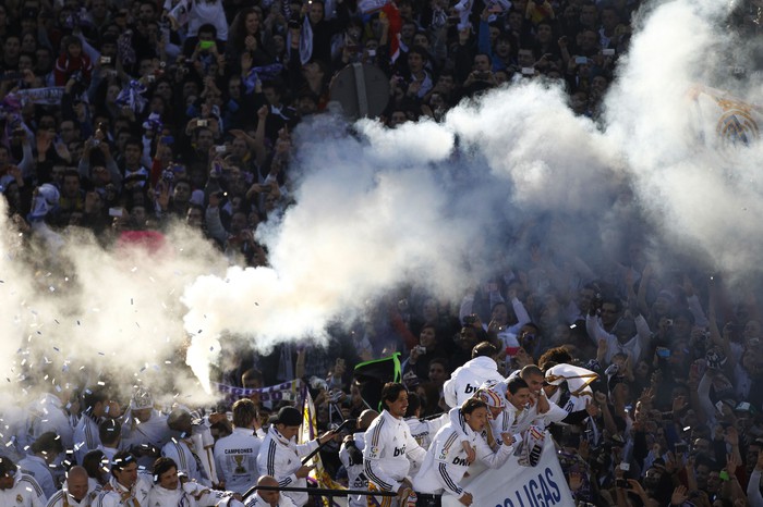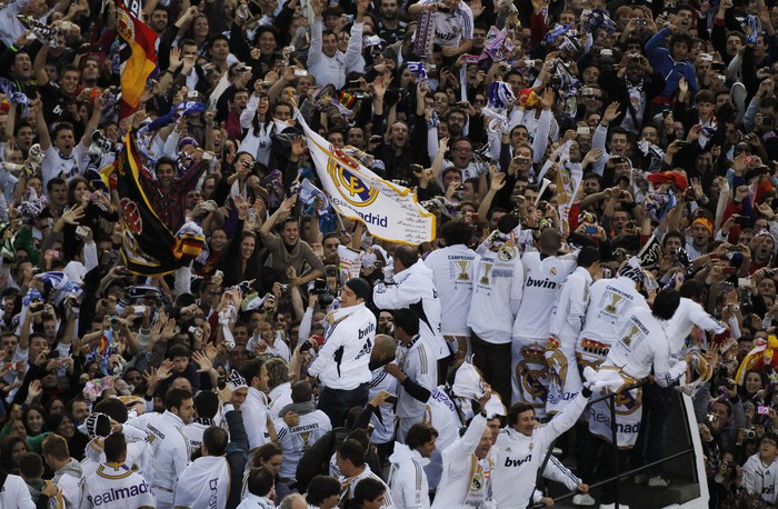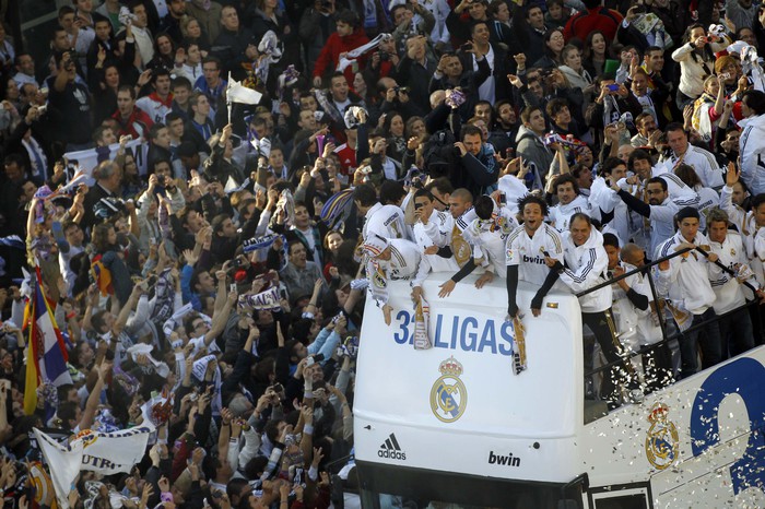 Тысячи болельщиков мадридского «Реала» вышли на улицы испанской столицы, чтобы встретить своих любимцев, добывших 32-ю победу в чемпионате страны.