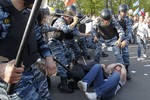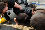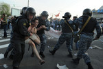 ОМОН разозлился и клиньями начал разделять демонстрантов. Газ пускали еще несколько раз, и в дыму, в предзакатном солнце были видны дубинки, опускающиеся на головы оппозиционеров. Били жестко, до крови, лицом об асфальт, волокли за волосы и одежду - вне зависимости от пола и возраста. Мужчину средних лет били ногами сразу несколько бойцов, и толпа заорала «Убийцы!».