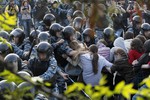 Веселье прекратилось, когда лидер «Левого фронта» Сергей Удальцов призвал участников акции сесть на асфальт. «Все садимся, а то проиграем!»,- орал он в мегафон. «Мы здесь не для того, чтобы расходиться», - заявил он «Газете.Ru». Несколько десятков человек действительно сели, и сидели минут 20. Удальцов в это время время в мегафон требовал переговоров с полицией. Полиция его не услышала, люди встали, и тут же начали бежать - задыхаясь от перцового газа. «Козлы вонючие»,- рявкнул на полицию молодой человек, зажимая рот и нос платком. На самом деле, полиция потом утверждала, что газ распылил кто-то из участников в толпе.