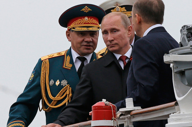 Президентский катер объезжает корабли ВМФ РФ. На катере вместе с ним находится министр обороны Сергей Шойгу.