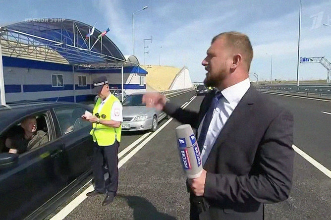 Из Якутии мы перемещаемся на Тамань, к самому началу Крымского моста, пересекающего Керченский пролив. Корреспондент спрашивает сотрудника ГИБДД об обстановке на мосту. По словам сотрудника полиции, с каждым днем автопоток увеличивается. Корреспондент решил задать вопрос и водителю, который в рамках проверки был остановлен сотрудником ГИБДД.