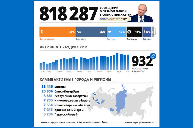 Всего за время эфира в социальных сетях было зафиксировано около 820 тыс. сообщений с упоминанием «Прямой линии», причем 33% из них были размещены в «Одноклассниках», 26% — «ВКонтакте», 17% — в Твиттере.