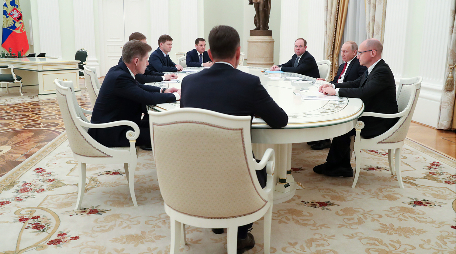 Тем временем, Путин впервые встречается с избранными на последних выборах губернаторами, в первую очередь с теми, кому удалось одолеть кандидатов от власти. Речь идет о возглавляющих Владимирскую область и Хабаровский край членах ЛДПР Владимире Сипягине и Сергее Фургале, а также коммунисте Валентине Коновалове, который возглавляет Хакасию. Присутствует на встрече и новоизбранный губернатор Приморья Олег Кожемяко, который занял свой пост последним среди присутствующих, и губернатор Ненецкого автономного округа Александр Цыбульский.