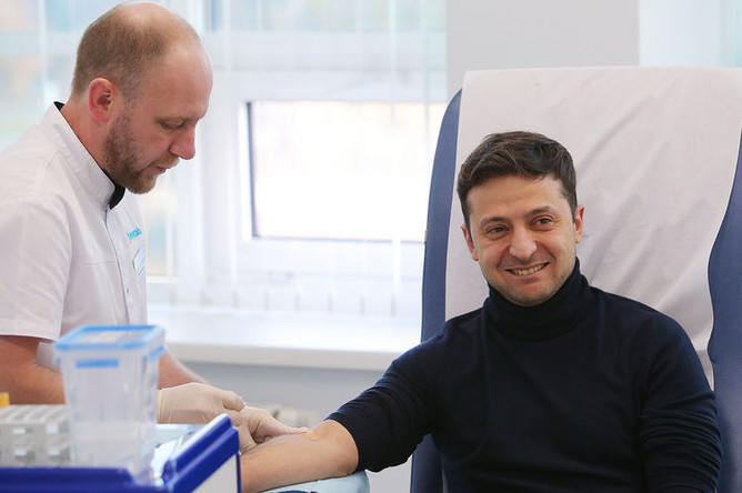 Сперва журналистов не пропустили в кабинет, где кандидат сдавал анализ крови. Однако Зеленский попросил пропустить корреспондентов, чтобы они смогли сделать фото.