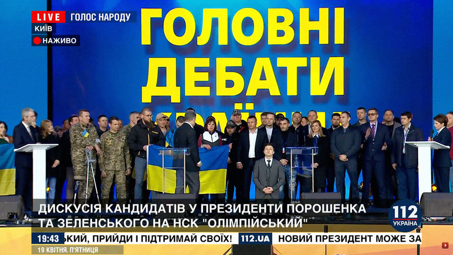 7 апреля Порошенко призвал Зеленского провести дебаты на стадионе ровно через неделю. Однако шоумен отказался. Глава штаба Порошенко Олег Медведев заявил, что глава государства придет на дебаты в студию Общественного телевидения в последнюю пятницу перед выборами, в соответствии с законодательством.