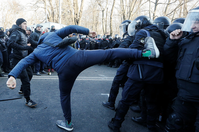 «Правоохранители остановили граждан и начали проводить с ними профилактическую беседу... но митингующие начали с полицейскими потасовку, которая переросла в схватку. По предварительным данным, в результате конфликтной ситуации телесные повреждения получили двое полицейских», — заявили в пресс-службе киевской полиции.