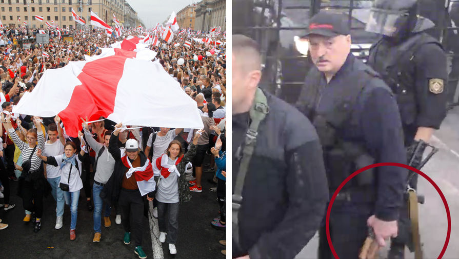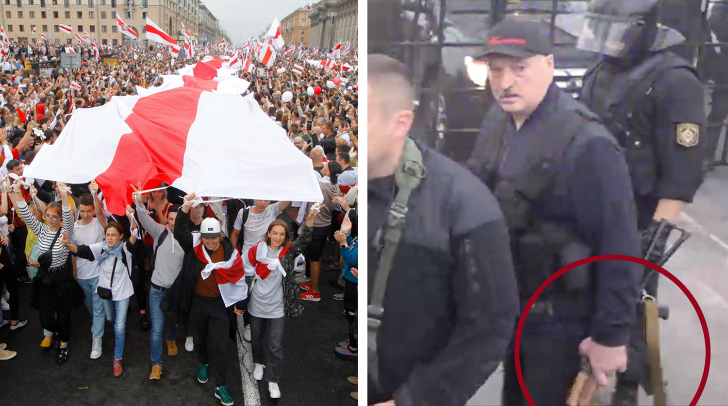 Спустя некоторое время в СМИ появились сообщения, что на территории резиденции Лукашенко приземлился вертолет. Журналисты предположили, что глава государства собирается улететь с места митингов. Но он, наоборот прилетел — с автоматом и в бронежилете. Вместе с Лукашенко из вертолета вышел и его сын Николай. Он также был вооружен и в каске.