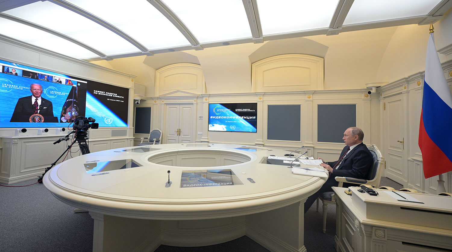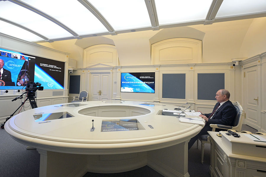 Президент США Джо Байден (на мониторе) и президент России Владимир Путин принимают участие в Саммите лидеров по вопросам климата в формате видеоконференции, 22 апреля 2021 года