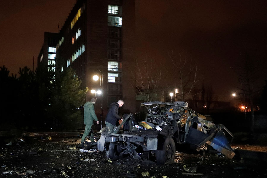 Взорванный автомобиль возле здания Правительства ДНР, 18 февраля 2022 года