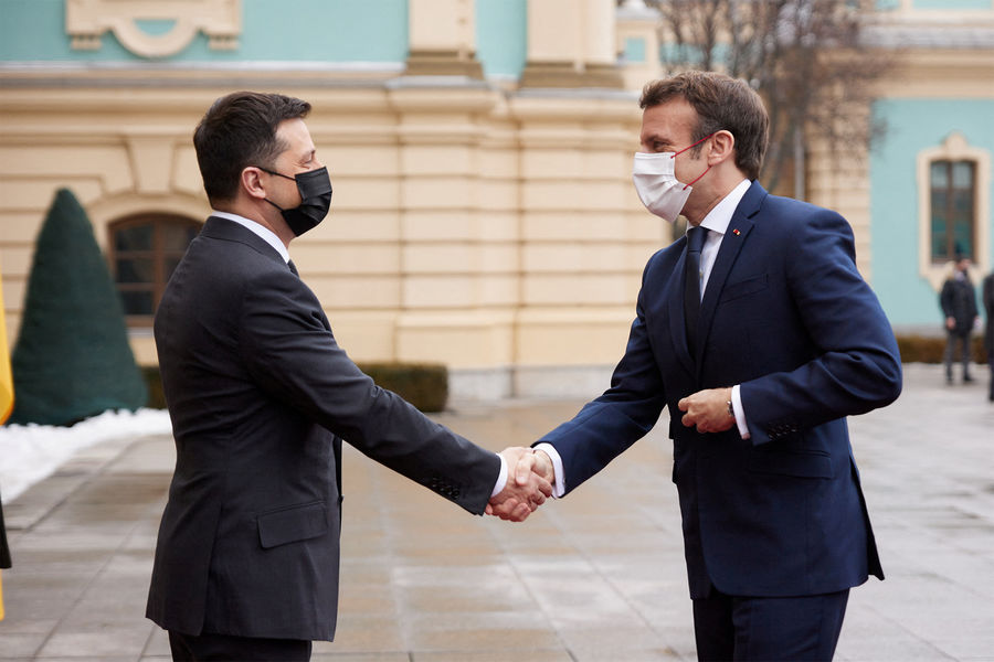 Президент Украины Владимир Зеленский и президент Франции Эммануэль Макрон во время встречи в Киеве, 8 февраля 2022 года