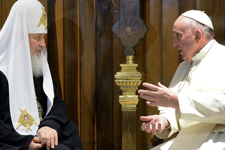 Впервые патриарх Кирилл и папа Римский Франциск встретились в 2016 году в аэропорту кубинской Гаваны.