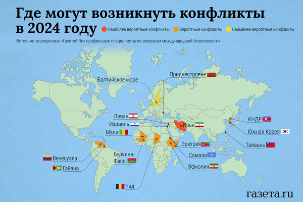 Опрошенные «Газетой.Ru» эксперты сходятся на том, что остров, который Китай считает своей частью, может превратиться в горячую точку в 2024 году, но далеко не он один. Заместитель директора Института политического и военного анализа Александр Храмчихин считает, что новое противостояние может возникнуть в Латинской Америке и на Корейском полуострове.