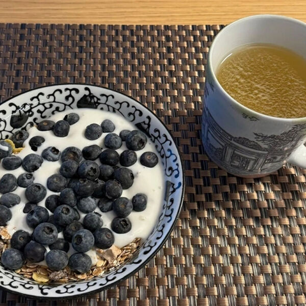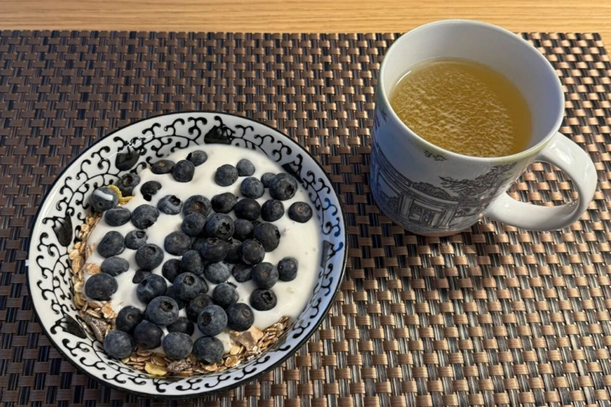 На снимке можно увидеть мюсли с йогуртом и черникой, а также кружку с напитком.