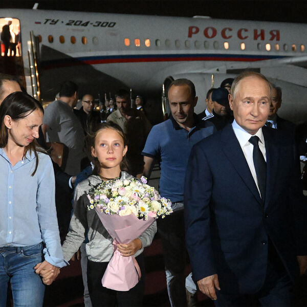 Анна и Артем Дульцевы с дочерью в аэропорту Внуково, где их встречает президент РФ Владимир Путин, Москва, 1 августа 2024 года