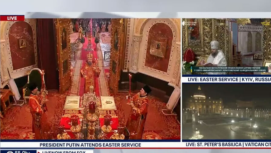 Также около получаса Fox News вел трансляцию и из московского храма Христа Спасителя. Богослужение там провел патриарх Кирилл, в храме находился и президент России Владимир Путин.