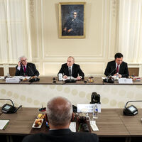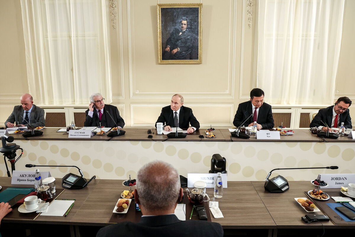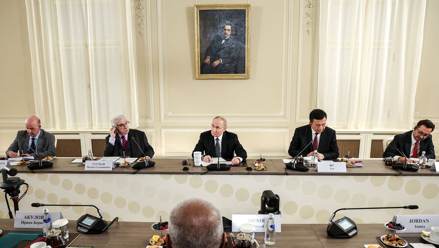 Президент РФ Владимир Путин на встрече с руководителями международных информационных агентств в Санкт-Петербурге. Слева направо: директор по международным связям EFE (Испания) Хосе Мануэль Санс Минготе, первый заместитель генерального директора ТАСС Михаил Гусман. Второй справа: глава китайского информагентства «Синьхуа» Фу Хуа.