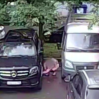 ФСБ опубликовала видео, на которых девушка в розовой кофте наклоняется к припаркованному во дворе автомобилю Mercedes-Benz и что-то делает около него.