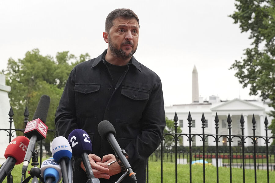 Президент Украины Владимир Зеленский выступает в парке Лафайет напротив Белого дома после встречи с президентом Дональдом Трампом и европейскими лидерами, 18 августа 2025 года