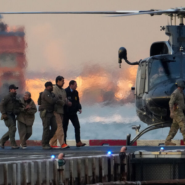 Сотрудники правоохранительных органов выводят задержанного президента Венесуэлы Николаса Мадуро и его супругу Силию Флорес из вертолета перед доставкой в федеральный суд Манхэттена, Нью-Йорк, 5 января 2026 года