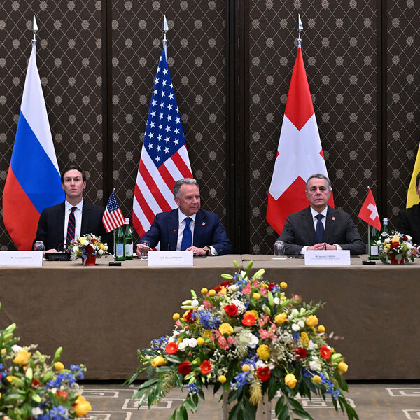 Министр армии США Дэниел Дрисколл, зять президента США Джаред Кушнер, специальный посланник президента США Стивен Уиткофф, глава МИД Швейцарии Иньяцио Кассис, глава отдела международной безопасности МИД Швейцарии, посол Габриэль Люхингер (слева направо) во время трехсторонней встречи делегаций России, США и Украины в Женеве, 17 февраля 2026 года