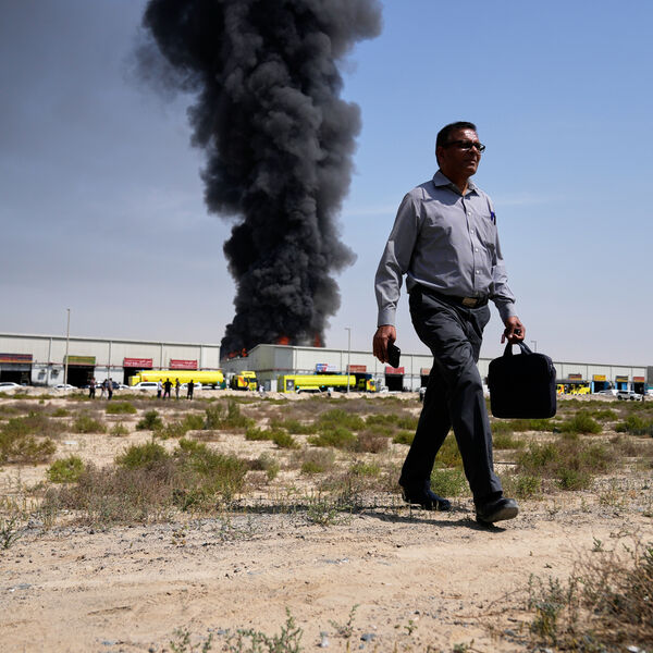 Мужчина на фоне дыма, поднимающегося над складом в Шардже после иранских ударов по Дубаю. ОАЭ, 1 марта 2026 года