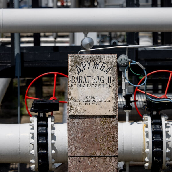 Камень, установленный в честь открытия нефтепровода «Дружба», на Дунайском нефтеперерабатывающем заводе в Сажаломбатте, Венгрия, 2022 год