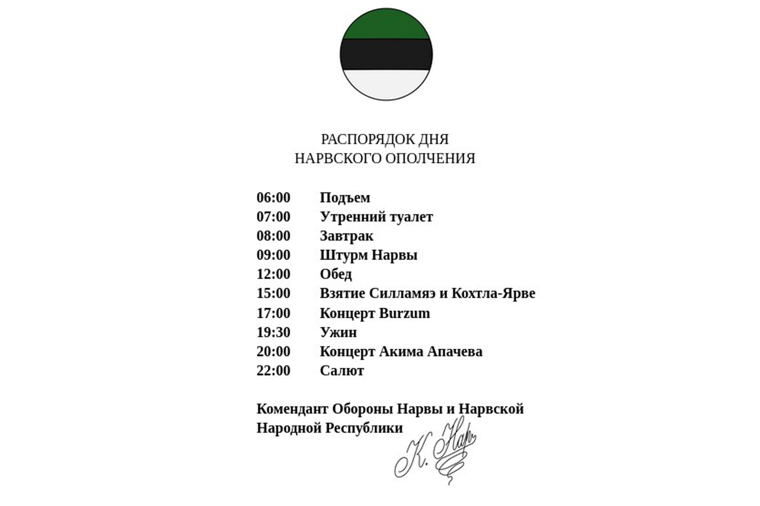 Публиковали и картинки с «распорядком дня нарвского ополчения». В списке — штурм Нарвы в 09:00, взятие соседних городов Силламяэ и Кохтла-Ярве в 15:00, а вечером — «концерт Акима Апачева».