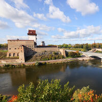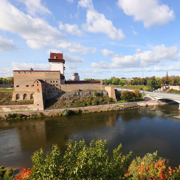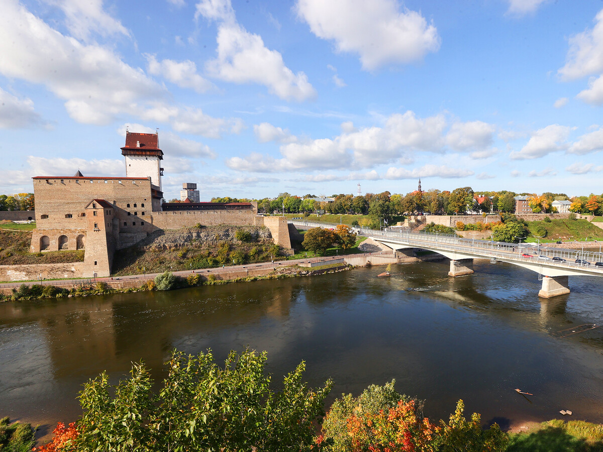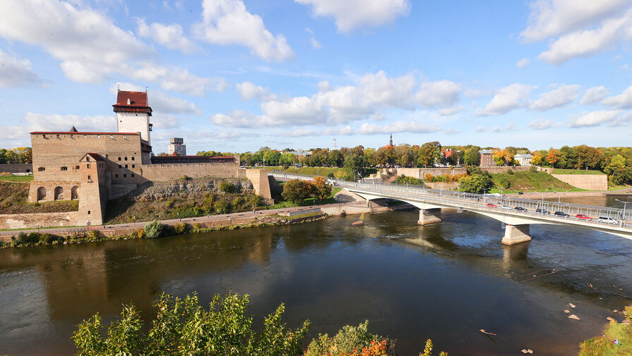 Вид на Нарвскую крепость и мост через реку Нарва, соединяющий Россию с Эстонией, 2023 год