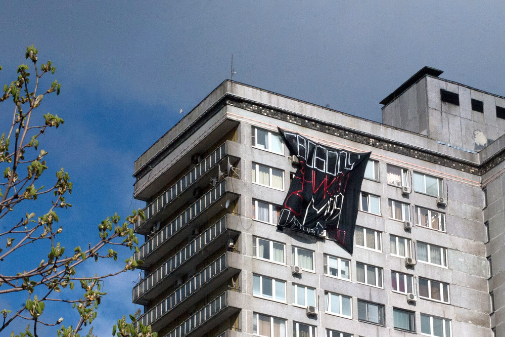 На баннере площадью 90 квадратных метров, который бросили с крыши, написано «Свободу узникам 6 мая».