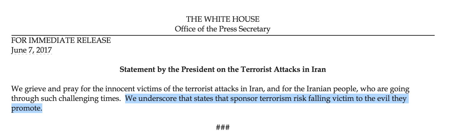 «Мы скорбим и молимся за невинных жертв террористической атаки в Иране и за народ Ирана, который проходит через такие сложные времена», — говорится в тексте заявления.