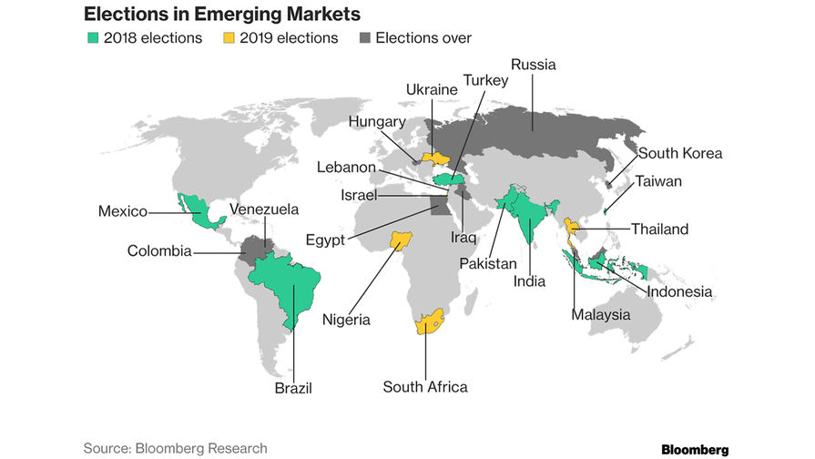 Материал посвящен роли выборов в экономике развивающихся стран. На прилагающейся карте Украина обозначена желтым цветом, а Россия — темно-серым, при этом Крым окрашен в светло-серый цвет.