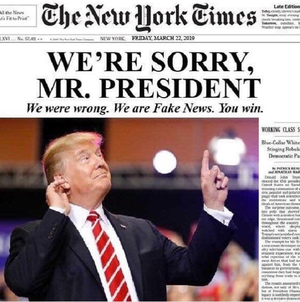 «Нам жаль, господин президент. Мы были не правы. Мы — фейк ньюс. Вы победили», — говорится в фейковом выпуске NYT от 22 марта.