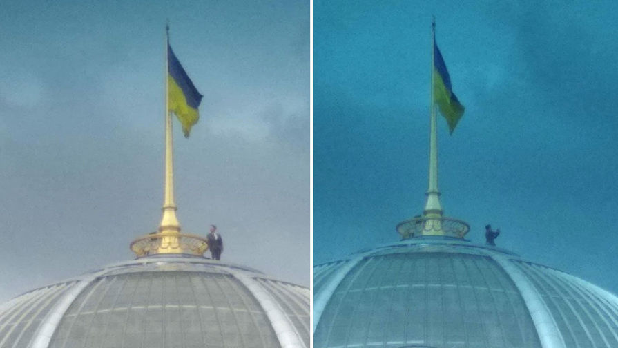 В Сети опубликованы фотографии человека, который похож на президента Украины Владимира Зеленского, на куполе здания Верховной рады. Фото в соцсетях опубликовал блогер.