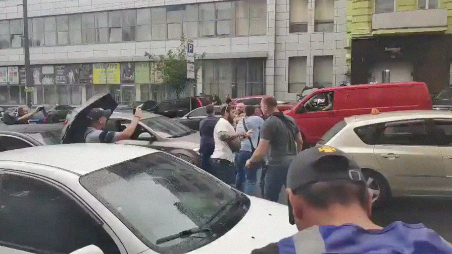 На кадрах видно, как на капот машины, в которую садился Порошенко после допроса в Государственном бюро расследований, кинулся мужчина.