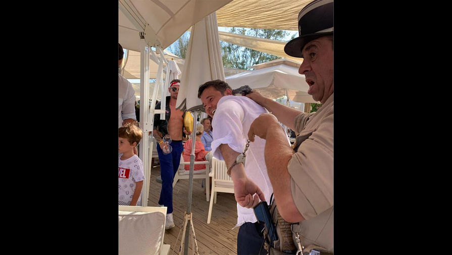 На снимке Богдан предстал в необычном амплуа: на него надели наручники, а один из правоохранителей приставил к его голове пистолет.
