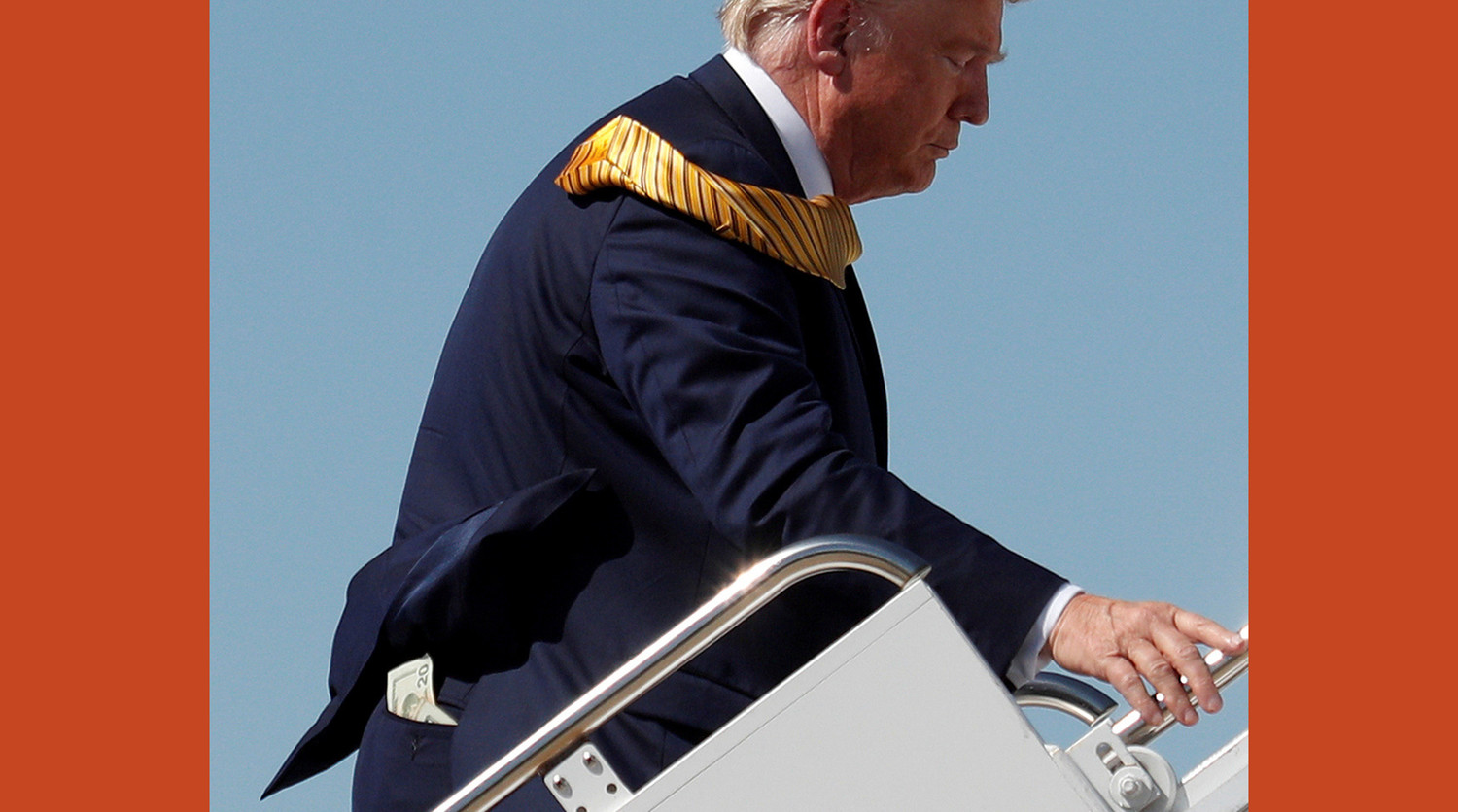 Денежную купюру заметили на видео, где Трамп поднимался в самолет ВВС-1 в Маунтин-Вью, штат Калифорния. Скомканная бумажка торчала из его заднего кармана и озадачила социальные сети.