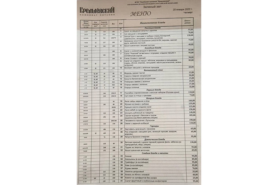 Telegram-канал «Будни депутата» опубликовал фотографию меню столовой Госдумы