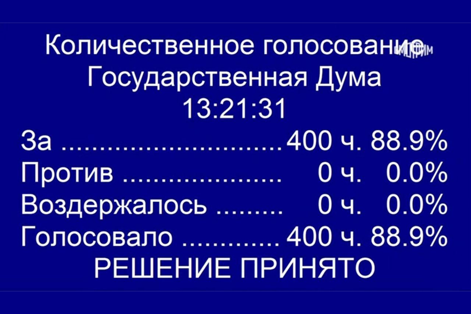 «За» проголосовали 400 депутатов (88,9%), голосовавших «против» или «воздержавшихся» не было.