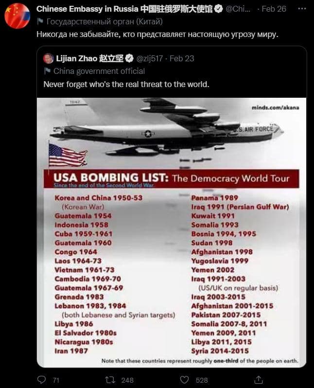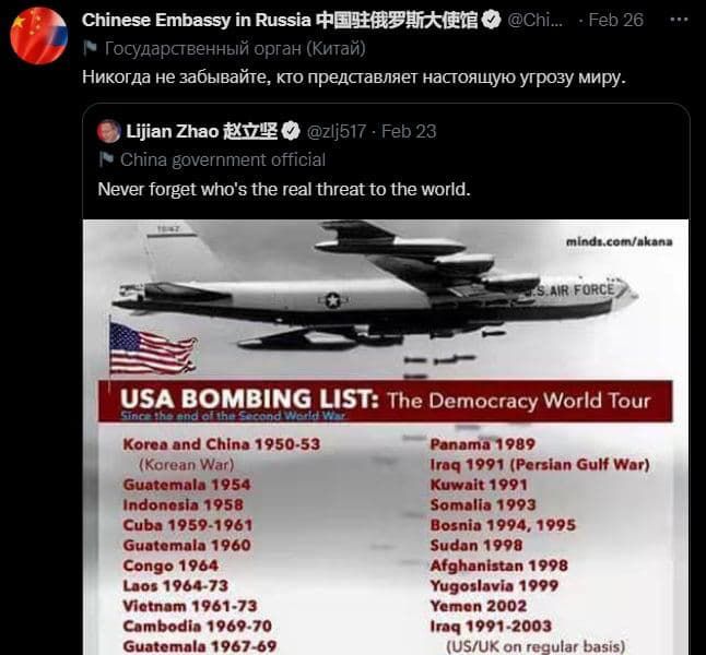 Посольство Китайской Народной Республики в России в Twitter сделало репост записи заместитель директора Департамента информации МИД КНР Чжао Лицзяня, в котором он напомнил, что именно Соединенные Штаты являются реальной угрозой миру, сообщает РИА «Новости».