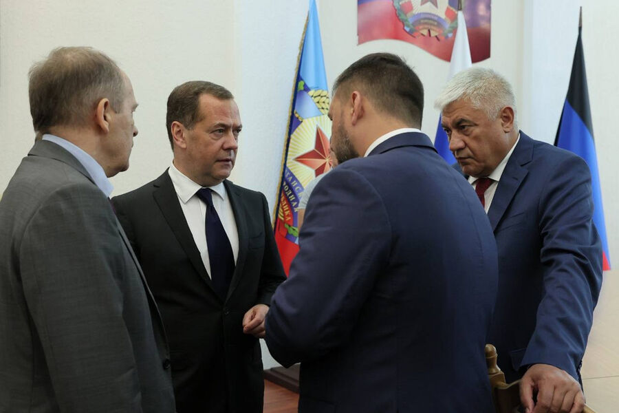«Чтобы лучше защитить жителей ЛНР, ДНР и других освобожденных территорий», — назвал цель своего визита Медведев.