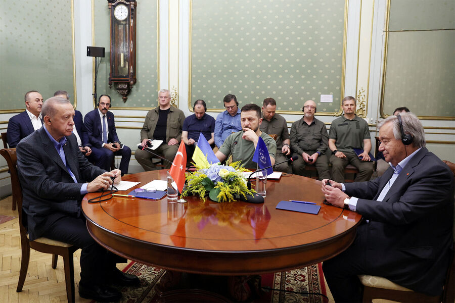 Ранее Зеленский заявил, что обсудил с генсеком ООН Антониу Гутерришем во Львове ситуацию вокруг Запорожской АЭС (ЗАЭС) и согласовал параметры возможной отправки туда миссии агентства.