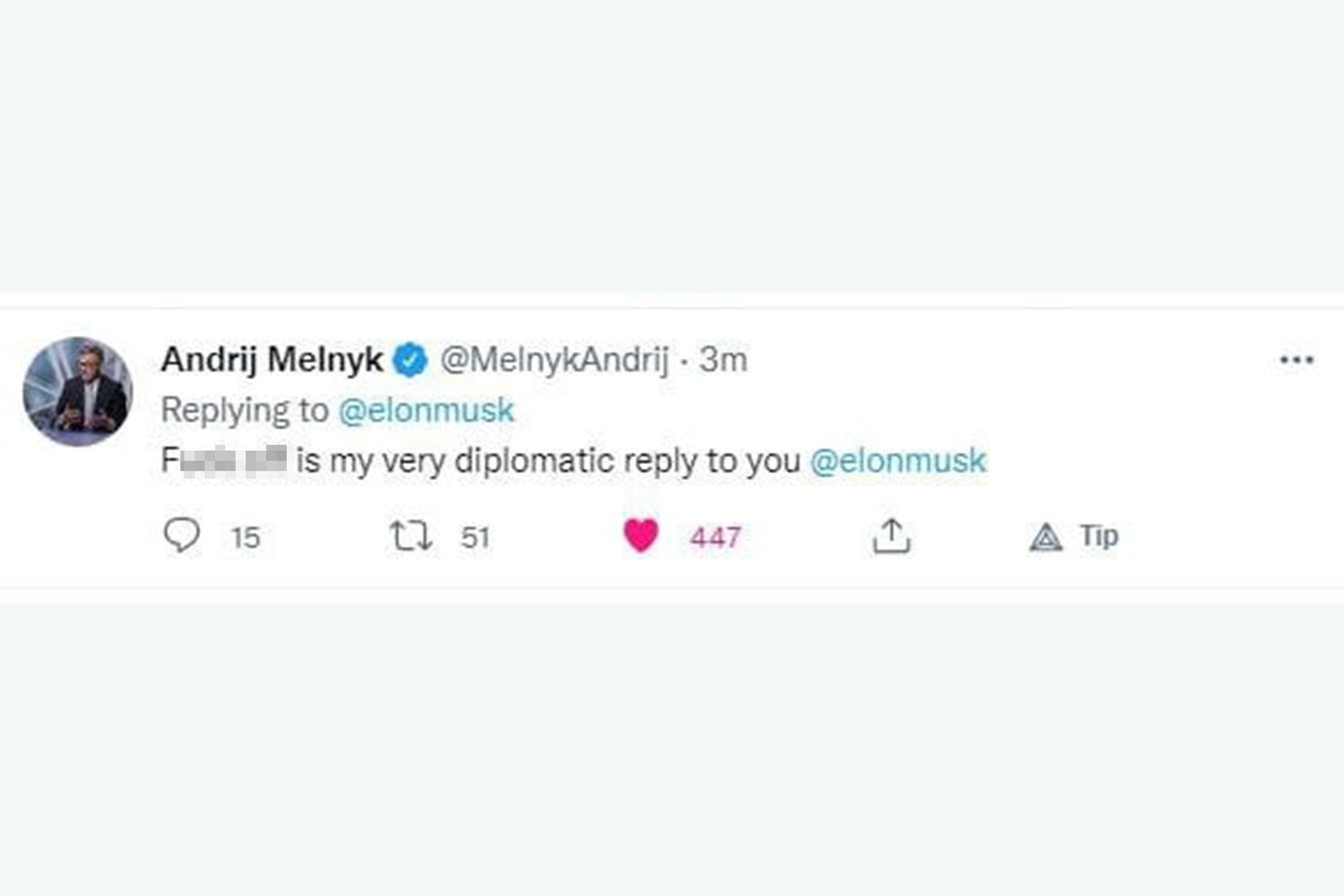 Украинский дипломат, бывший посол Украины в Германии Андрей Мельник нецензурно ответил американскому предпринимателю Илону Маску в Twitter на его недавнее предложение о мире между Россией и Украиной.