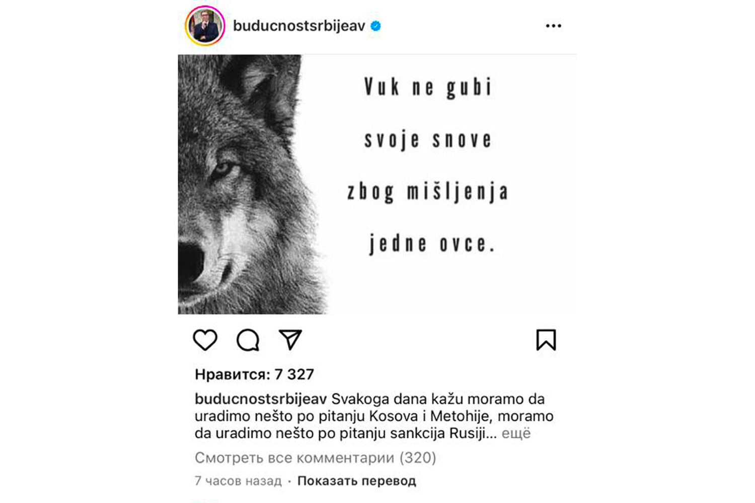 Президент Сербии Александр Вучич сравнил себя с волком, а Запад — с овцой. Он опубликовал соответствующий пост в своем Instagram (владелец компания Meta признана в России экстремистской и запрещена), прикрепив к нему фотографию данного животного.